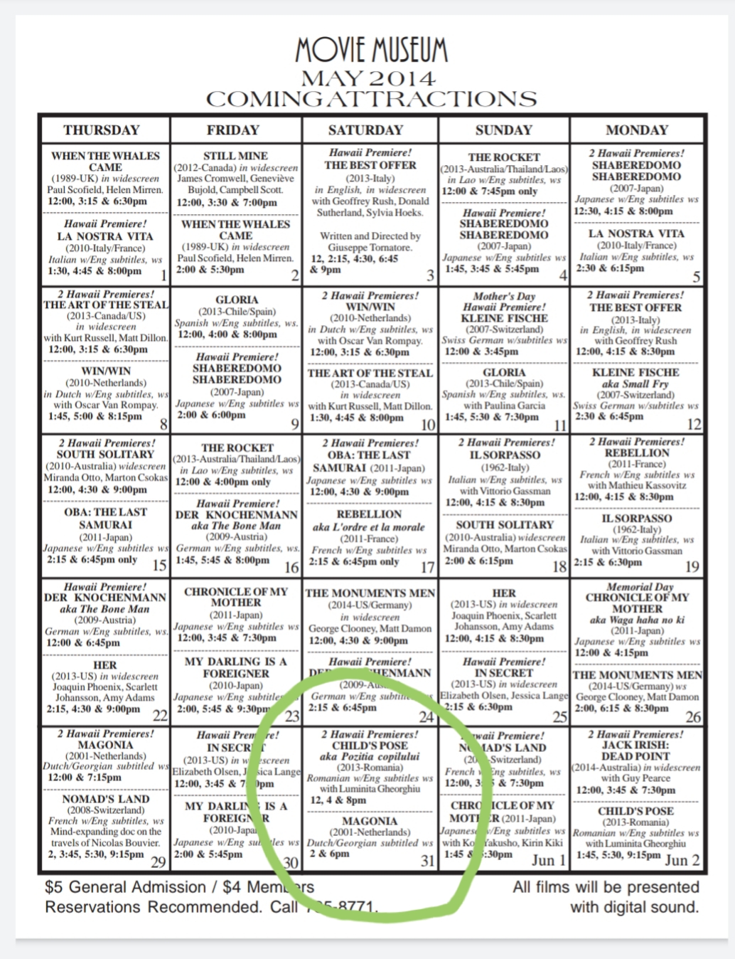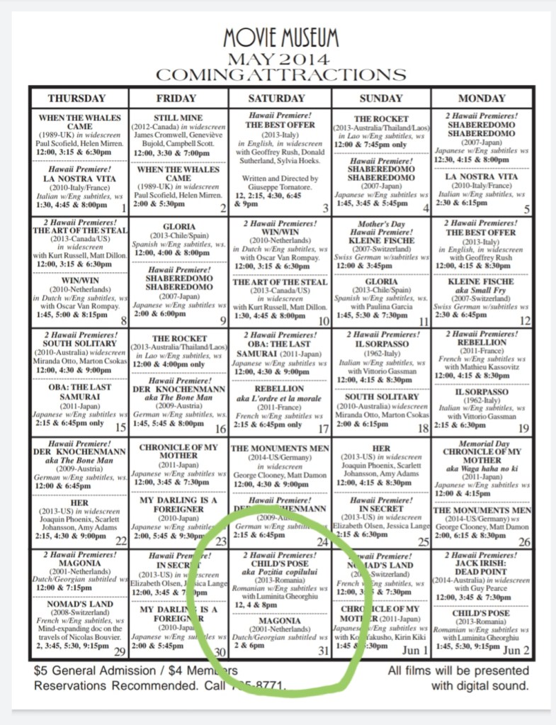 - Saw the Hawaiian Premeres – Child’s Pose – aka Pozitia Capilului (2013 – Romania) 12pm