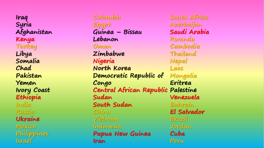 - Don’t travel to any countries highlighted in Red or Black. You will be more likely to be killed on either side and to detained at any time.