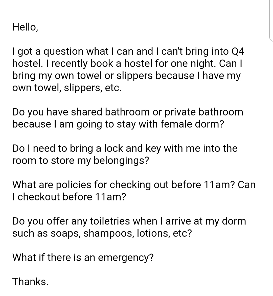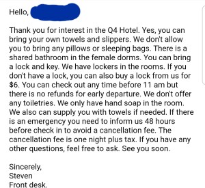 - Email or inquire questions about what’s included and what is not included during the stay at a hostel.