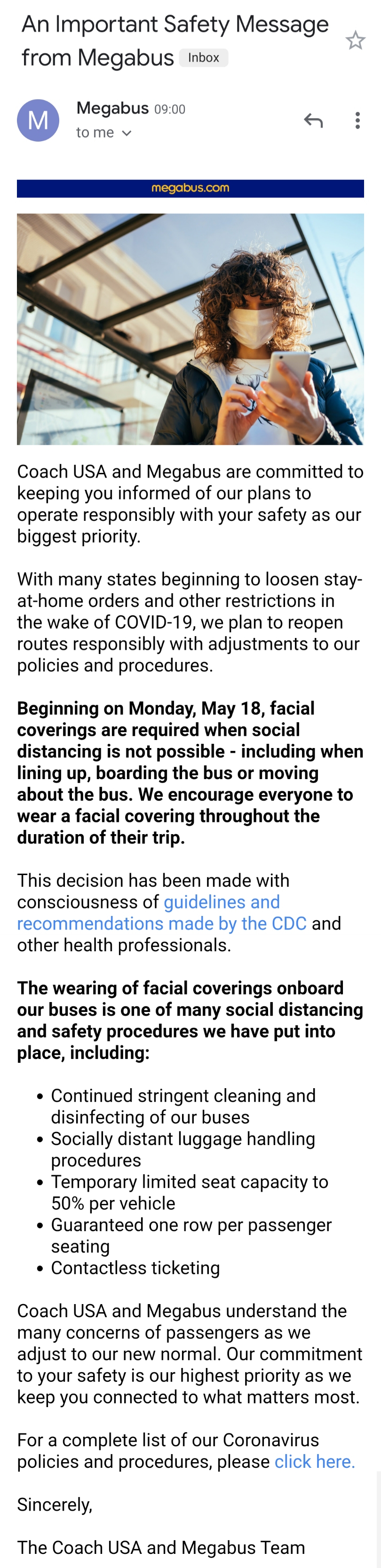 For travel buses, such as Megabus, the rules apply the same recommendations. There is temporary no seating next to passengers.